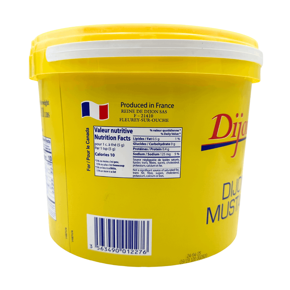 A classic French condiment, Dijon mustard, is a must-have staple for any gourmet kitchen. This Dijon mustard is crafted from whole mustard seeds, a touch of vinegar and then perfectly blended to create a vibrant yellow hue and a smooth, creamy texture with a balance of spicy warmth and subtle sweetness. Dijon mustard is a versatile food staple: serve it on the side of meat dishes, slather it on sandwiches, or mix it with other ingredients to make a peppery dressing or sauce. Whether used as a zesty dip or an ingredient for culinary creations, our Dijon mustard enhances the flavour of any dish. This 5kg bucket is perfect for catering or professional cooks.