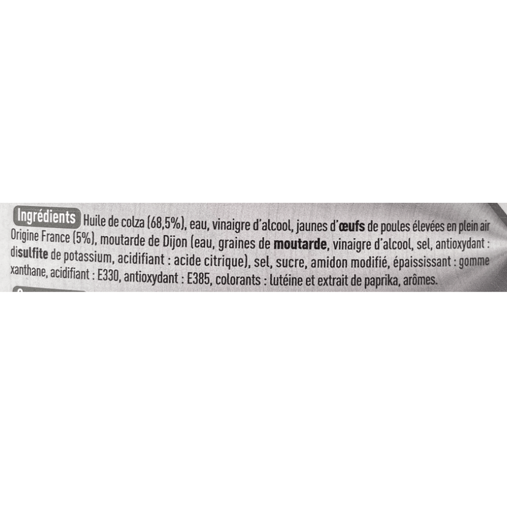 Ingredients: rapeseed oil (68.5%), water, alcohol vinegar, powdered of free range EGG yolk 5% (Origin France), Dijon MUSTARD (water, MUSTARD seed, alcohol vinegar, salt, antioxidant: potassium disulfite, acidifier: citric acid), salt, sugar, modified starch, thickening agent: xanthan gum, acidifier: E330, antioxidant: E385, colouring agents: lutein and paprika extract, aromas.